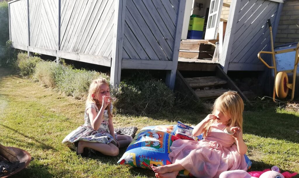 Den er lavet med brede trin, så brede at man kan sidde på dem og lige få en kop te om morgenen eller nyde solens varme stråler om foråret. Der er trin på tre af siderne, så ledes at vi nemt kan komme fra stuen og ud i køkkenhave eller mod kaningården. Om sommeren sidder vi der stort set ikke, men bruger den som ind og ud gang til haven.