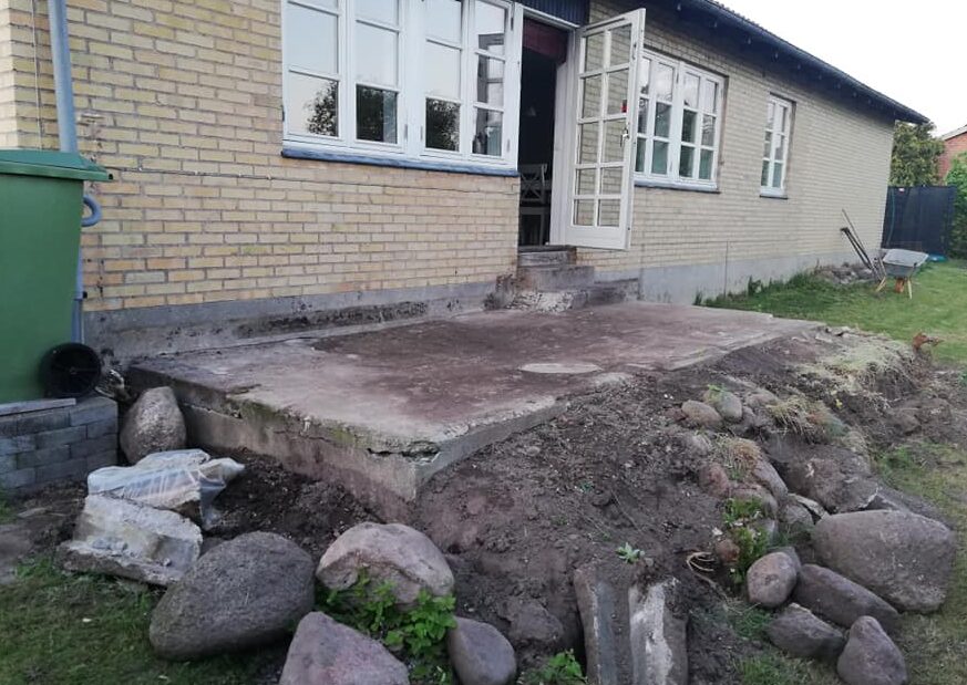 Dette skulle dog vise sig ikke at være lige til. Nu har hverken min mand eller jeg hænderne rigtigt skuret på i forhold til det håndværksmæssige, så i foråret 2020 fik vi en tømre og mure med ind over. De fik hurtigt pillet terrassen ned, men under den kom der et fundament frem. Der har formegentlig været en udestue på huset. Nu var vi meget glade for, at vi havde besluttet os for ikke selv at fjerne terrassen. Da fundamentet var væk og soklen på huset var blevet pudset op, blev der bygget trappe.