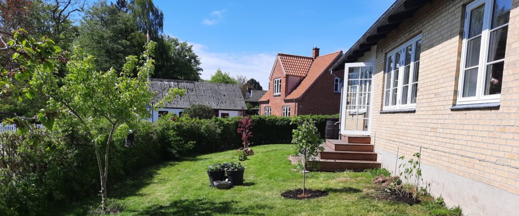 Da vi overtog vores hus sommeren 2015, var der på syd siden en gammel træterrasse op ad huset, med udgang fra stuen. Terrassen var hævet over jorden og havde et højt hegn på de tre sider. Vi oplevede det som en stor klods der fyldte meget i haven. Allerede da vi overtog huset, var terrassen begyndt at rådne, så den skulle skiftes på et tidspunkt. Grundet varmen på den side af huset om sommeren, fik vi oven i købet ikke brugt terrassen. Derfor besluttede vi at den skulle fjernes helt og i stedet erstattes af en trappe med brede trin. På den måde ville det blive mere fleksibelt, når vi skulle ud i haven, men det var stadig et sted vi kunne sidde, hvis lysten bød sig.